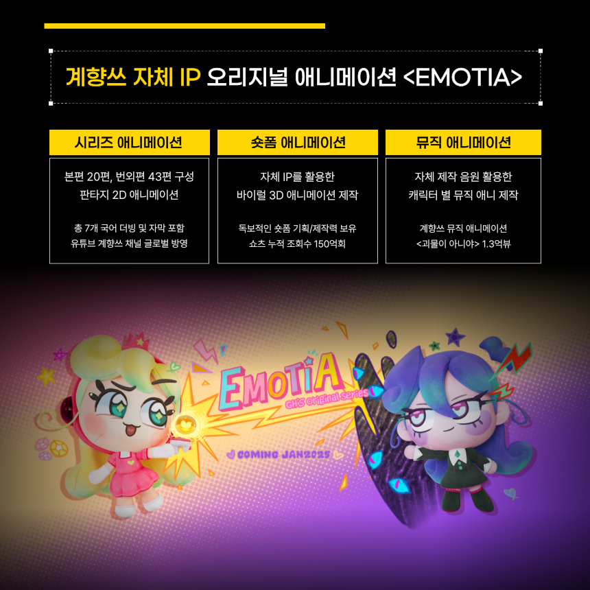 2025년 1월 말 자체 IP 오리지널 애니메이션 [EMOTIA]의 런칭을 준비 중이며, 이를 계기로 새로운 도약을 목표로 하고 있습니다.